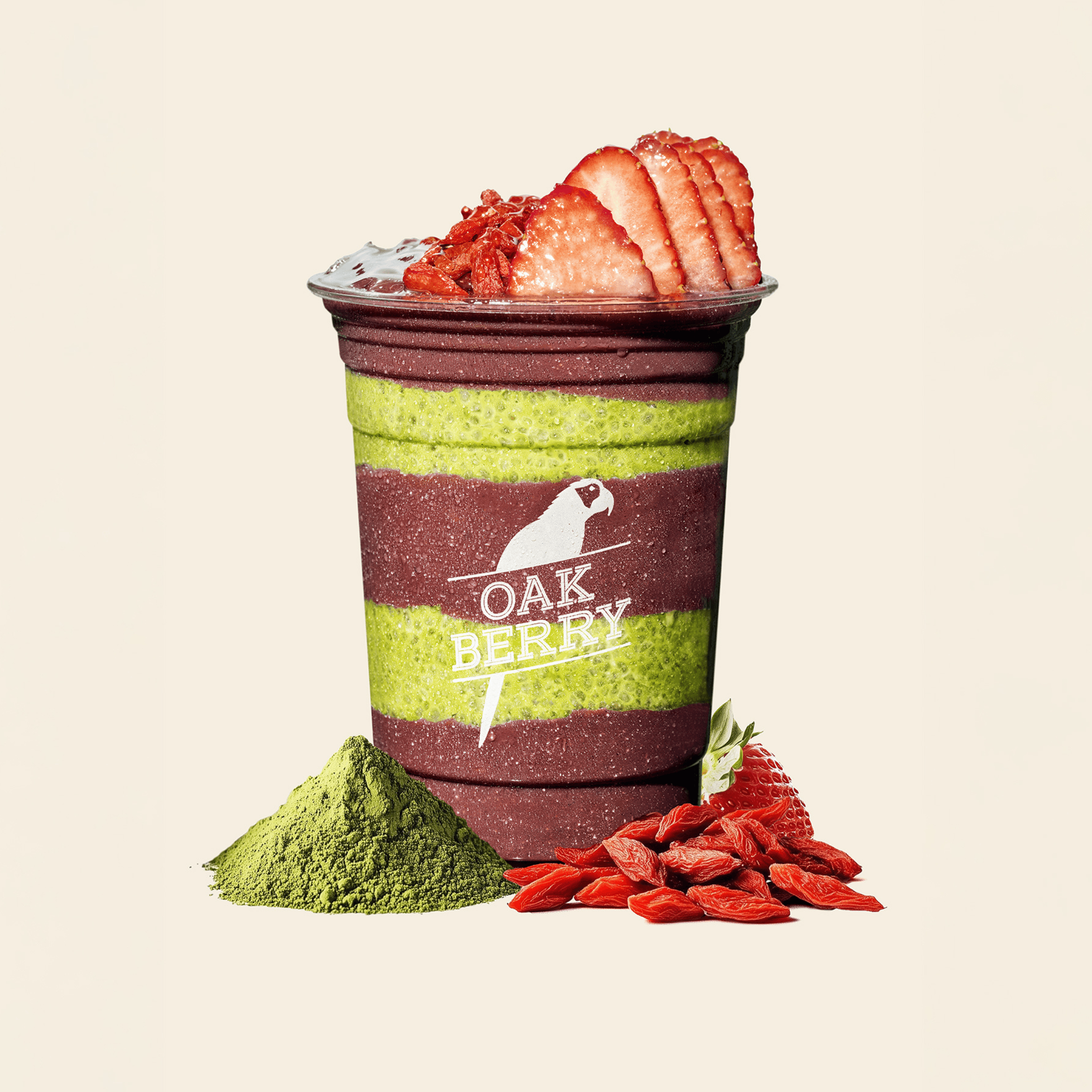 Acai, Double Matcha Chia Pudding, Strawberry, Goji Berry, Honey.